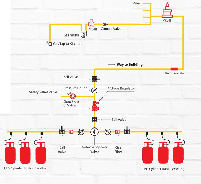 LPG cylinders are stored in a cylinders bank at the ground level and the regulators are installed in all the apartments. Special protected devices are installed in Gas bank. The system has multiple pressure regulation stages to supply LPG to user at low pressure and to make the system safer. This system is compatible to piped natural gas after the availability of natural gas in respective cities.